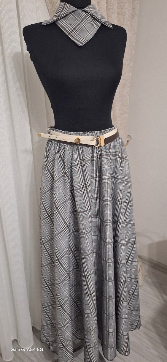 Gri Ekose Desenli Uzun Kemerli Etek
