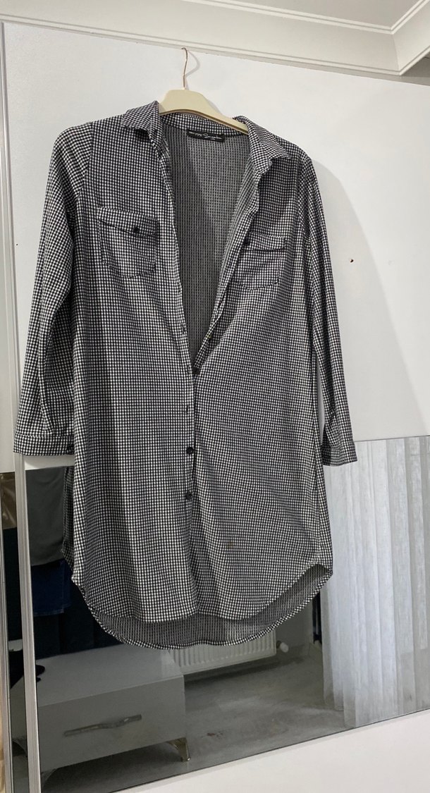 Gri ekose desenli keten kumaştan, uzun ve bol kesim, düğmeli ön ve yakası kesik detaylı günlük rahat gömlek. Çok az kullanıldı hiçbir kusuru yoktur. Tek üst yada tunik olarak elbise olarak kullanılabilir uzunlukta