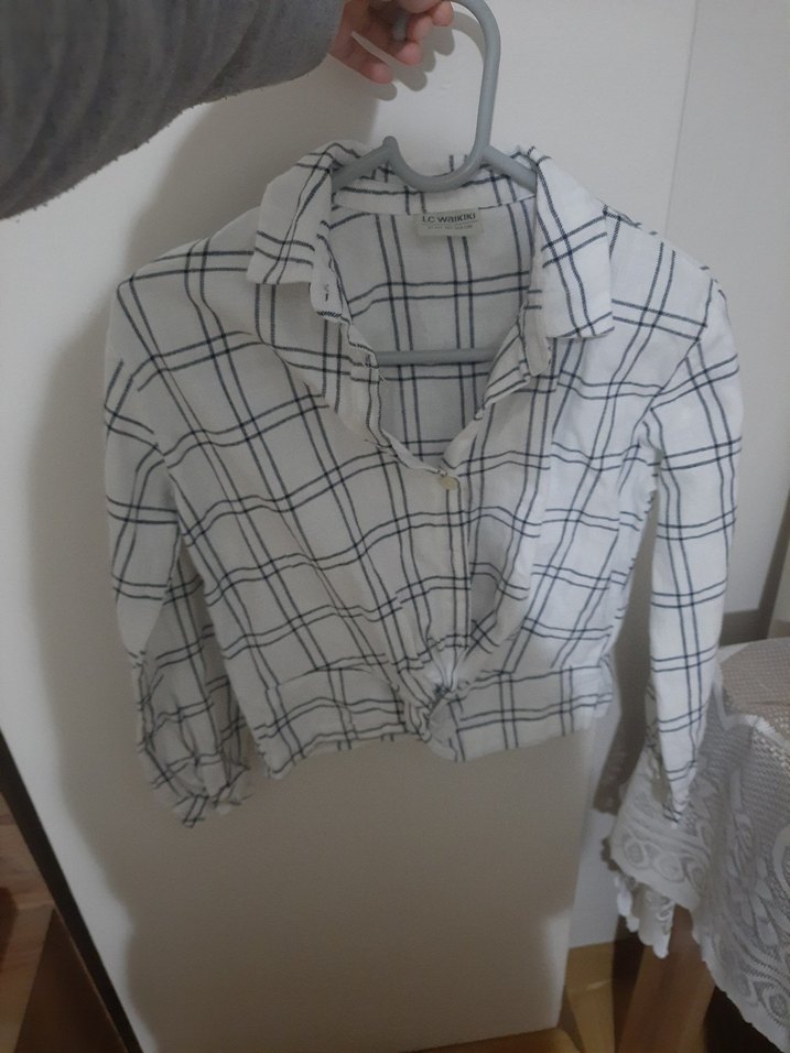 Gri ekose desenli, yakalı ve düğmeli beyaz gömlek. Uzun kollu, pamuklu kumaştan, midi uzunlukta ve bol kesimdir. Rahat sokak stiline uygun. iki koltuk arası 42 cm