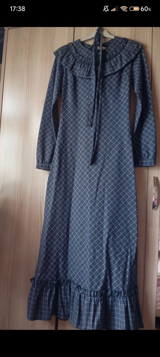 Gri renkte, ekose desenli ve pileli uzun kadın elbisesi. Uzun kollu ve kayık yaka tasarıma sahip, rahat kesimdir. Günlük kullanım için uygundur.