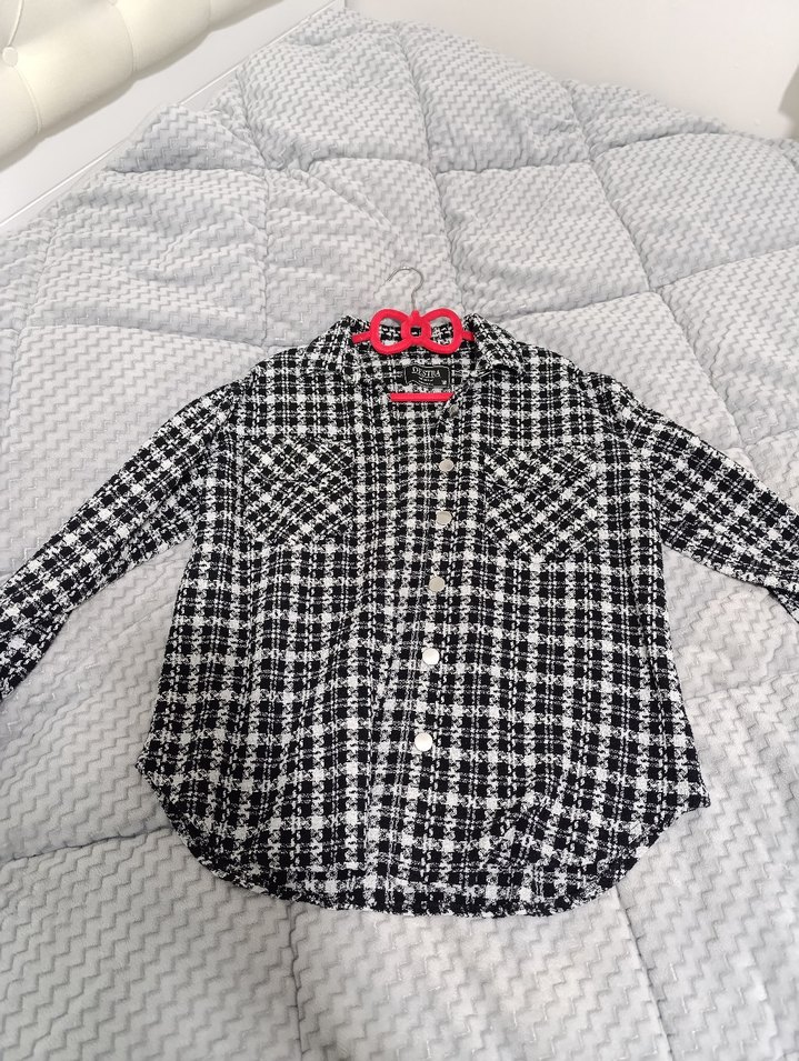 Kadınlar için düğmeli, uzun kollu ve notlu yaka detaylı gri ekose desenli gömlek. Sentetik kumaştan, rahat kesim ve midi uzunlukta, günlük sokak stiline uygun.
