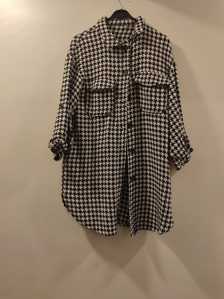 Gri ekose desenli gömlek, bol kesim ve uzun kolludur. Düğmeli önde, normal boyda ve notched yakalıdır. Günlük rahat stil için uygundur. koltuk altında yırtıklar var dikilmiş.