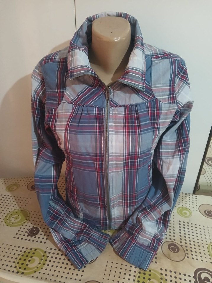 Kadınlar için uzun kollu, yakalı ve düğmeli gri ekose desenli gömlek. Sentetik kumaştan, normal kesim, günlük kullanıma uygun.