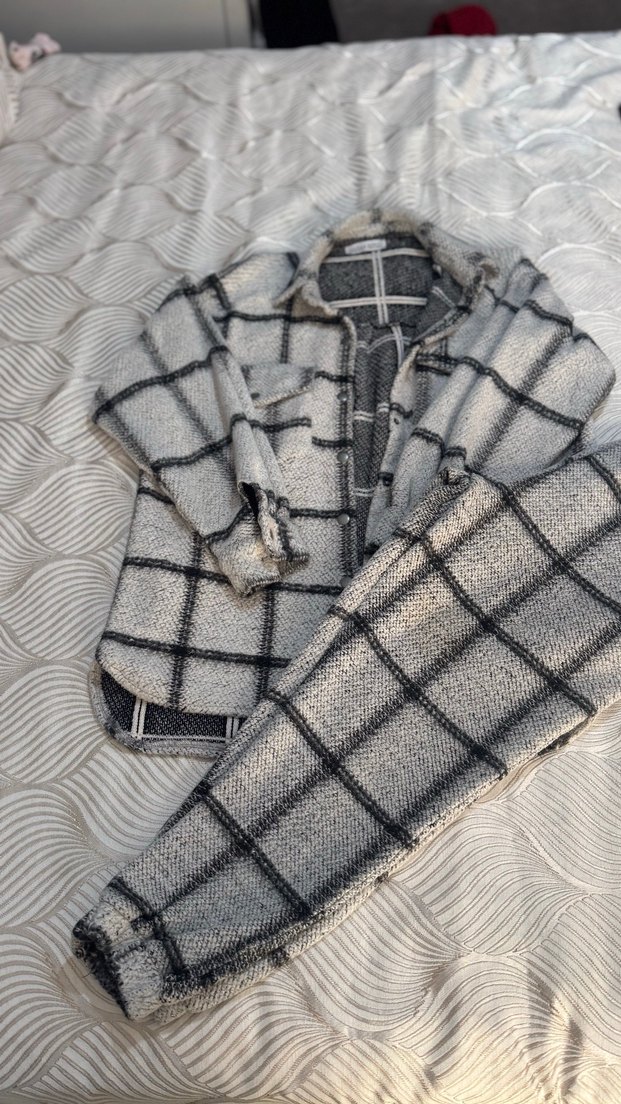 Gri ekose desenli, uzun ve bol kesim örgü kadın gömleği. Çentikli yaka ve uzun kolludur, günlük sokak modası için uygundur. Sadece ceketteki çıt çıtları eksik bir ve ya iki kere giyildi