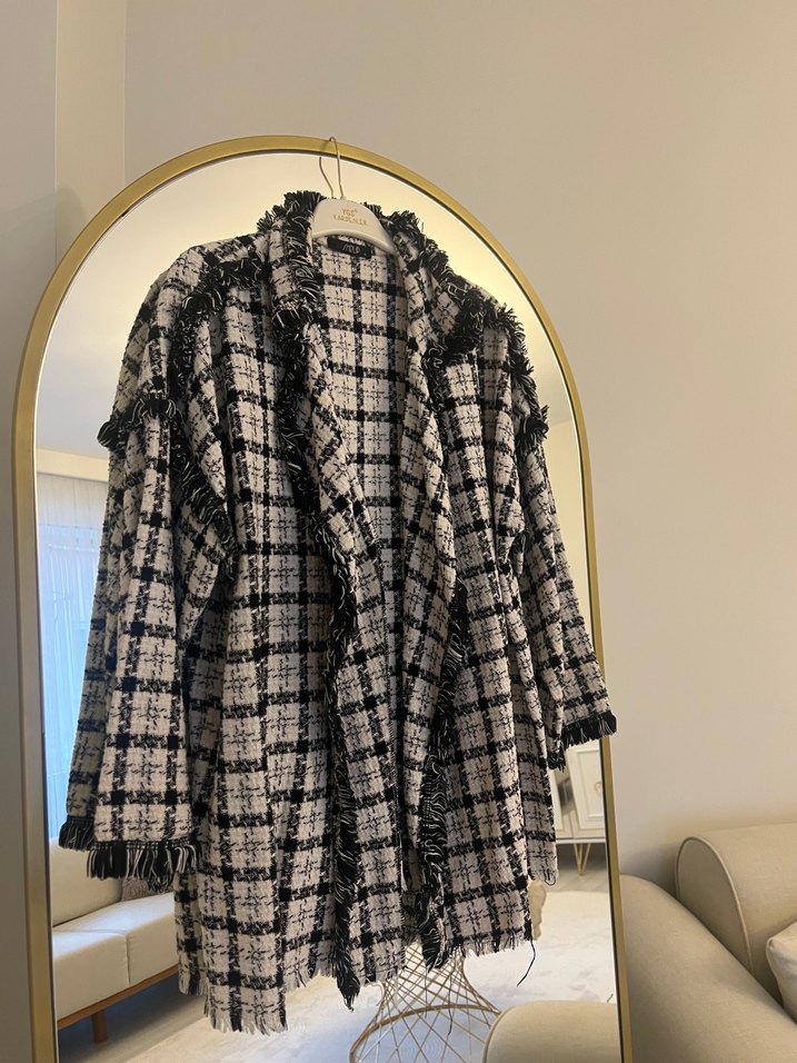 Gri ekose desenli, kürk detaylı uzun kaban. Notlu yaka ve regular kesimle günlük kullanıma uygun, klasik ve şık tarz sunar.