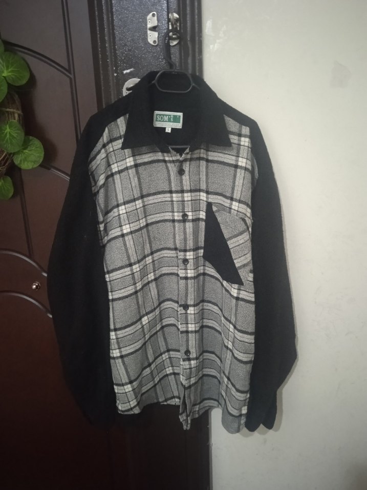 Bu erkek gömlek, uzun kollu, yaka detaylı ve bol kesimdir. Düğmeli ön kısmı ve gri ekose desenli, koyu renk kollu, yumuşak ve sıcak kumaştan üretilmiştir. Rahat sokak stili için uygundur.
