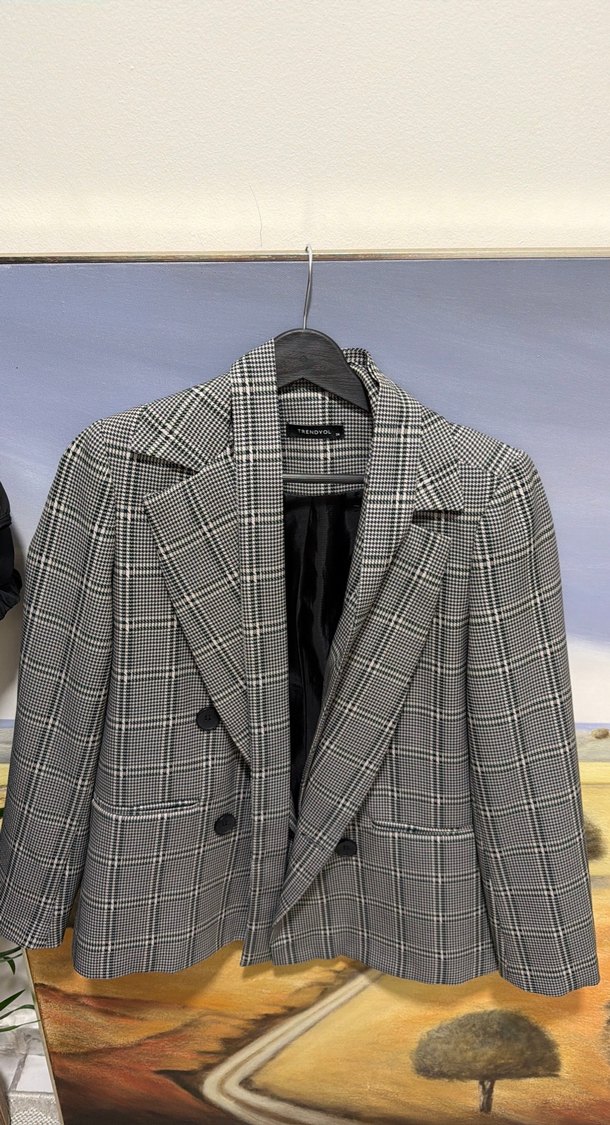 Notch yaka, düğmeli ve ekose desenli gri kadın blazer. Strappy kollu, normal kesim ve sentetik kumaştan, ofis için uygun.