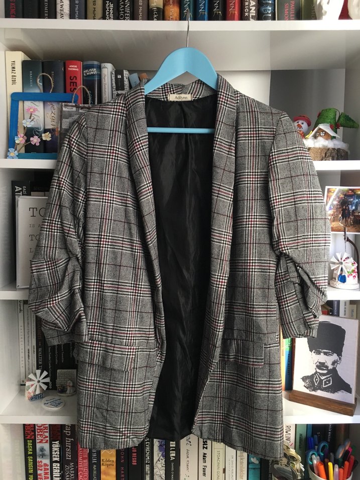 Gri ekose desenli, düğmeli, uzun kollu, midi boy ve regular fit kadın blazer. Ofis ve günlük kullanıma uygundur.
