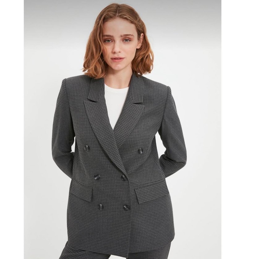 Gri Ekose Düğmeli Kadın Blazer Ceket