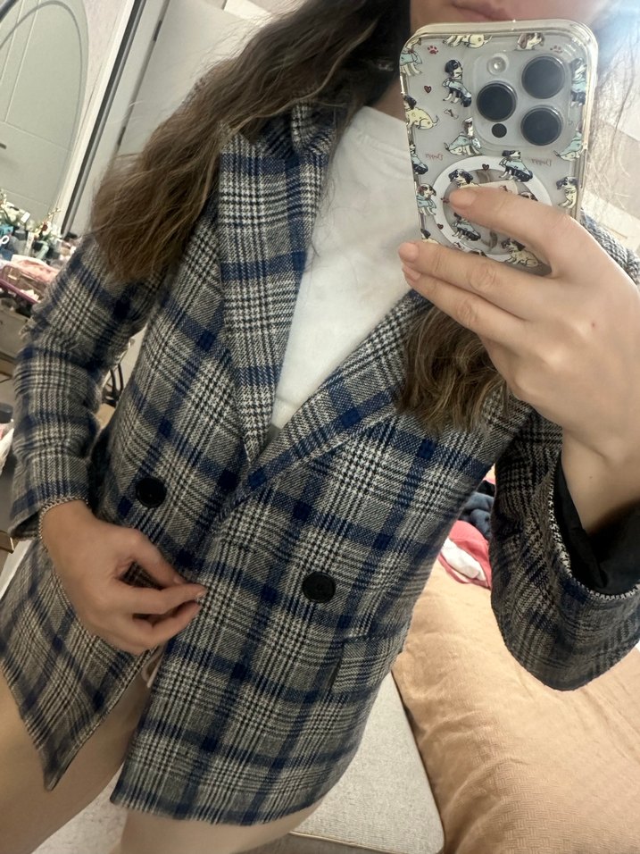 Gri ekose desenli, düğmeli, normal boy midi uzunlukta kadın blazer ceket. Uzun kollu ve regular fit kesimiyle günlük sokak stili için uygun. M beden iyi durumda.