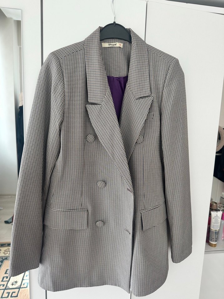 Gri ekose desenli, yaka düğmeli, normal kesim ve askılı kollu kadın blazer ceket. Midi boyda, ofis ve sokak stiline uygun, sentetik dokulu şık parça.