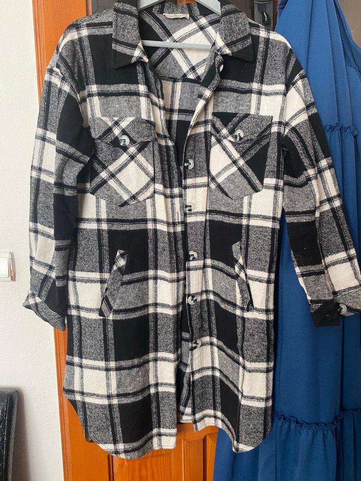 Pamuk kumaştan, uzun kollu, düğmeli, gri ekose desenli, midi boy ve bol kesim kadın gömleği. Günlük kullanıma uygundur.