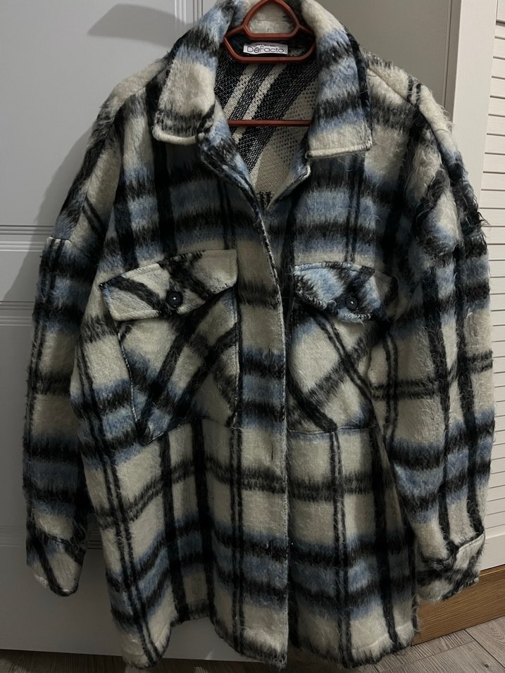 Gri ekose desenli, düğmeli, uzun kollu, rahat kesim kadın gömlek. Yumuşak ve sıcak kumaştan üretilmiştir, günlük kullanım için uygundur.