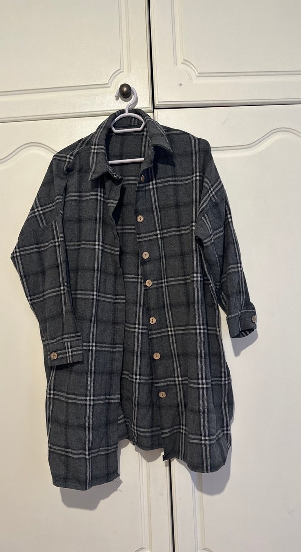 Gri ekose desenli, düğmeli, uzun kollu, notched lapel yakalı kadın gömlek. Normal uzunlukta, regular fit kesim, günlük rahat kullanıma uygun.