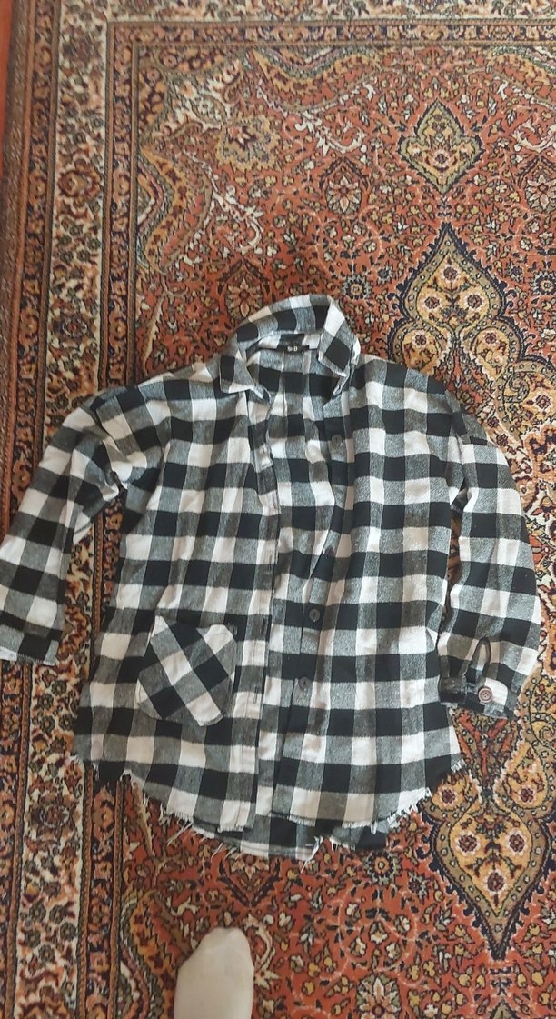 Gri ekose desenli, düğmeli, uzun kollu, yakalı, bol kesim kadın gömleği. Rahat ve normal boyda, günlük kullanıma uygun sokak stili gömlek.
