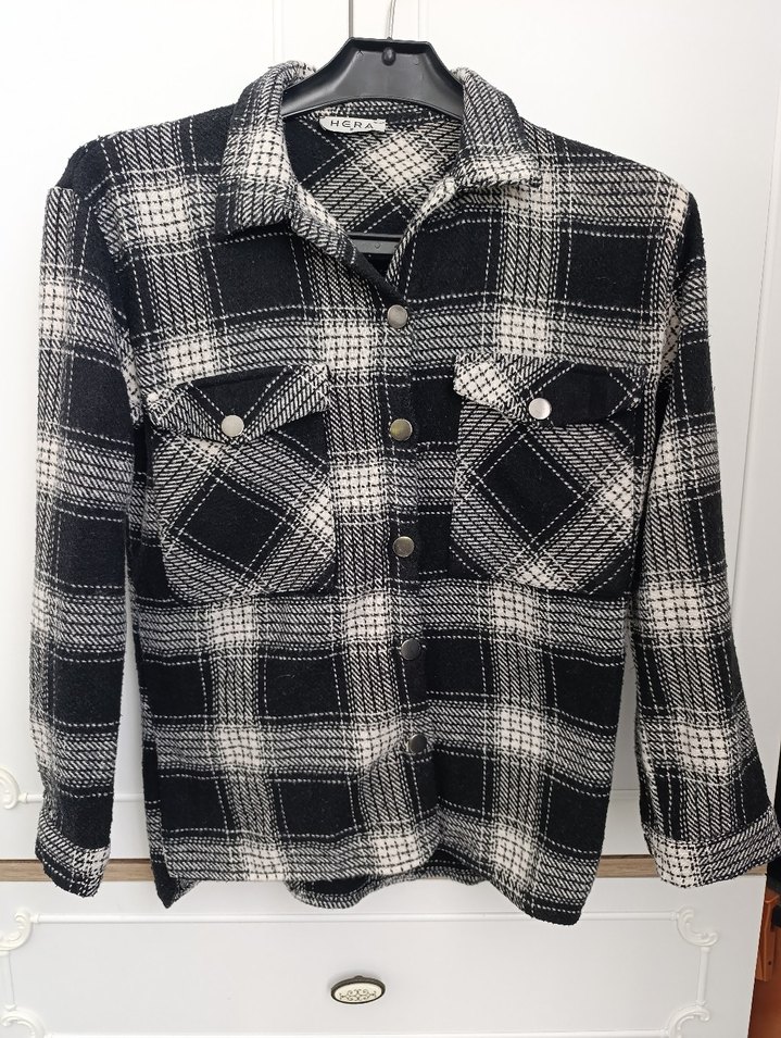 Gri ekose desenli kadın gömlek, düğmeli, uzun kollu ve kırmalı yakalıdır. Yumuşak yün kumaştan, normal kesim ve midi boyda, rahat sokak stili için uygundur.