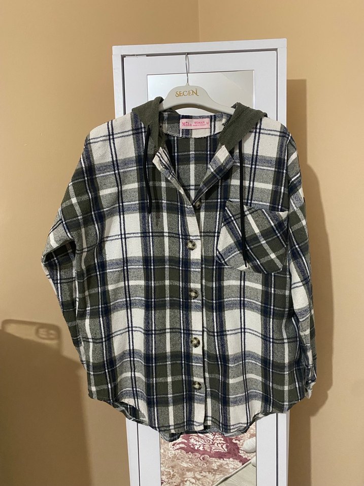 Gri ekose desenli, düğmeli ve pamuklu kumaştan yapılmış, uzun kollu, normal boyda, salaş kesim kadın gömlek. M ve L bedene olur