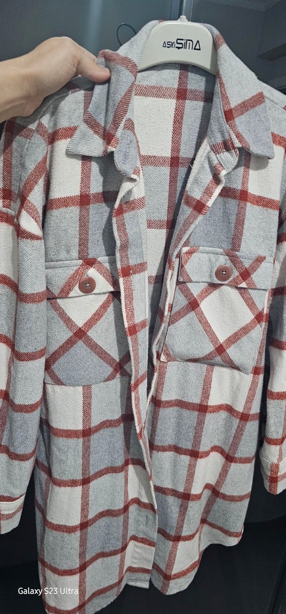 Gri ve kırmızı ekose desenli, düğmeli, uzun kollu, notched lapel yakalı, bol kesim kadın gömleği. Rahat ve günlük sokak stili için uygundur.
