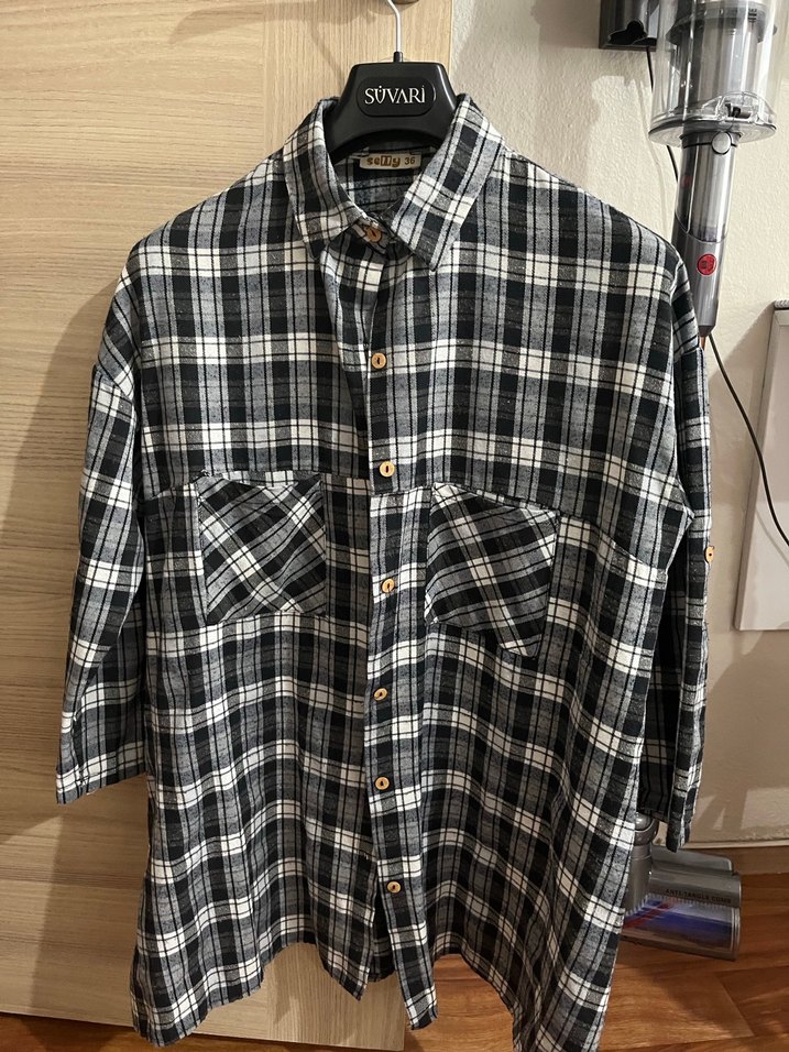 Pamuk kumaştan, gri ekose desenli, uzun kollu, düğmeli, normal boyda bol kesim kadın gömleği. Notlu yaka detayıyla günlük sokak stiline uygun.