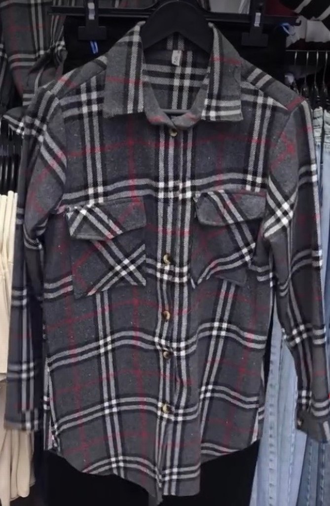 Gri ekose desenli, düğmeli ve uzun kollu kadın gömleği. Notlu yaka ve bol kesim, yumuşak dokulu kumaştan, rahat sokak stili için uygun.