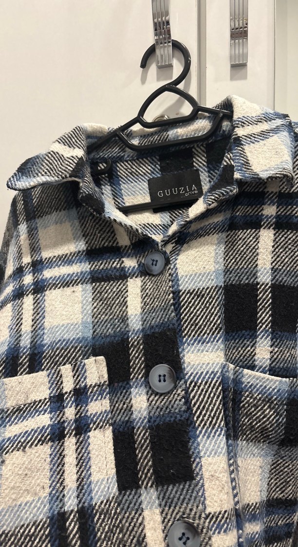 Gri ekose desenli, düğmeli ve yakalı kadın gömleği. Pamuk kumaştan, bol kesim ve uzun kolludur. Günlük kullanıma uygundur. Marka: GUUZIA. Kumaşı kalındır, ceket olarak kullanıma uygundur.