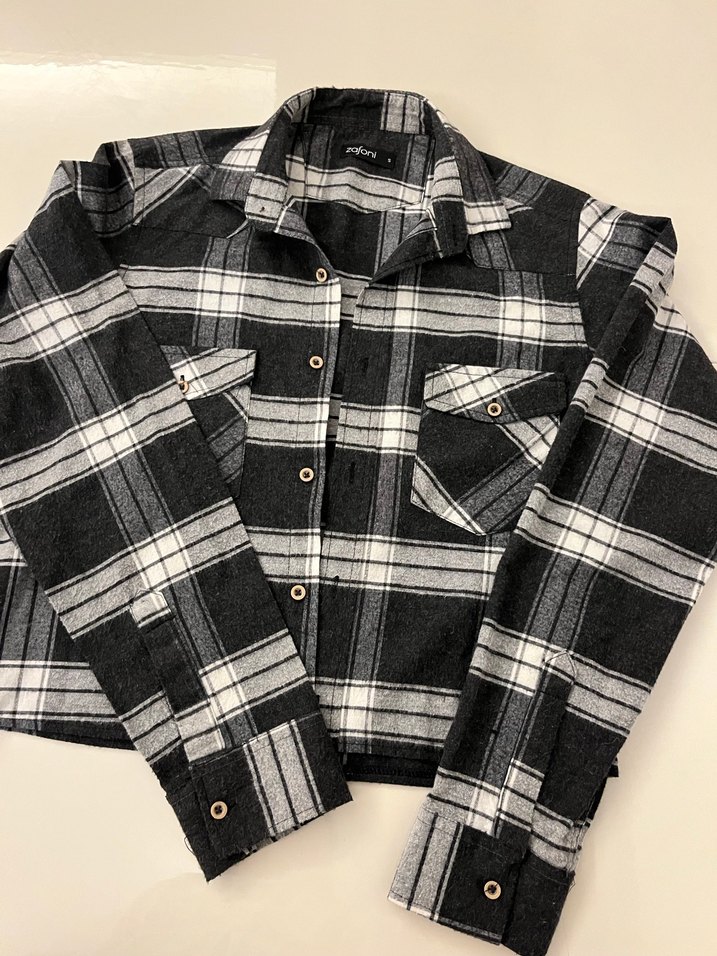 Pamuk kumaştan yapılmış, gri ekose desenli, uzun kollu, düğmeli ve salaş kesim kadın gömleği. Çift cep ve kesik yaka detayına sahiptir.