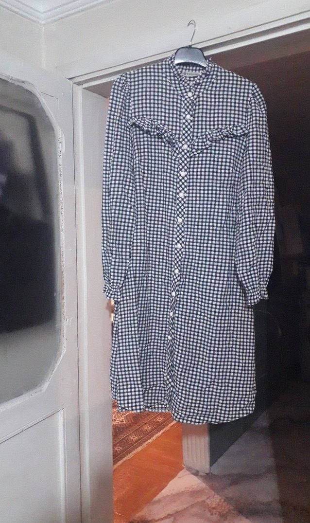 Gri ekose desenli pamuklu kumaştan, düğmeli ön ve çentikli yaka detaylı, bol kesim uzun kollu hamile tunik. hamile olamdan da giyilir boy 100 iki göğüs arası 50