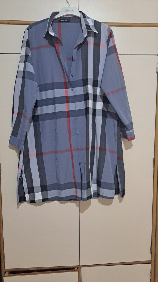 Gri ekose desenli, düğmeli, uzun kollu, yakalı ve rahat kesim kadın gömleği. Casual sokak tarzı için uygundur. ürünün yan yırtmaçi çok az açıldı dikilebilir ben dokunmadım. asiri severek aldım bjr kaç kez giydim dar geldiği için satışta
