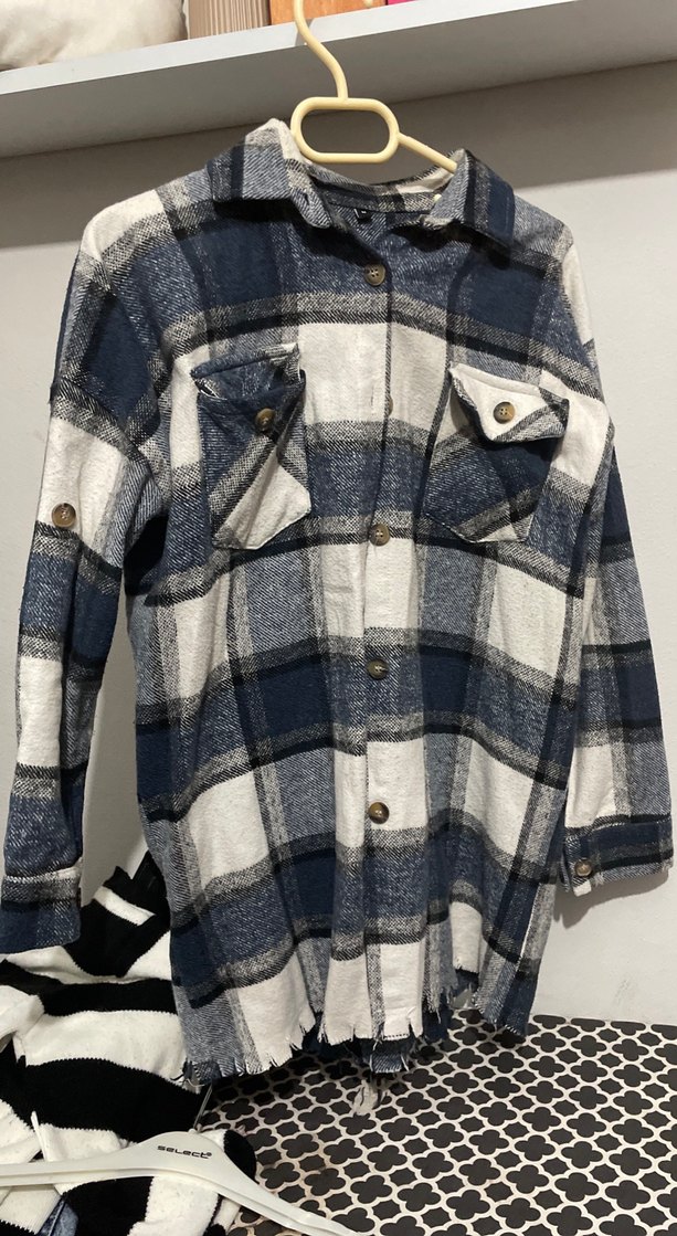 Gri tonlarda ekose desenli, düğmeli, uzun kollu, pamuklu, normal boyda, salaş kesim kadın gömlek. Rahat ve gündelik kullanıma uygun bir modeldir.