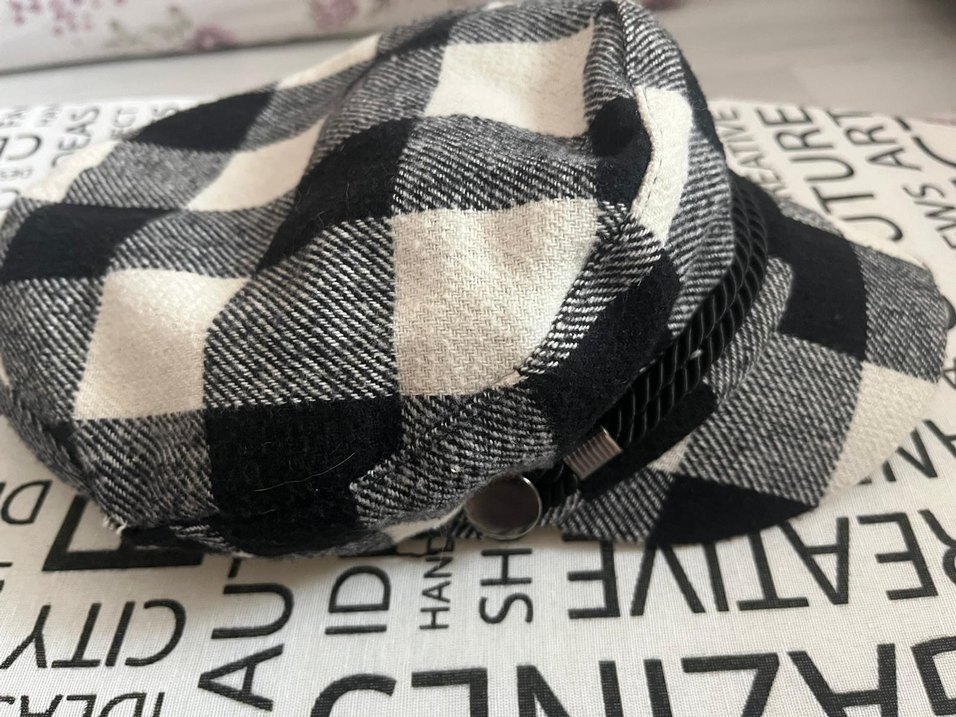 Gri tonlarda ekose desenli şapka Paris tarzı sokak modasına uygun, trend ve rahat bir görünüme sahiptir. .