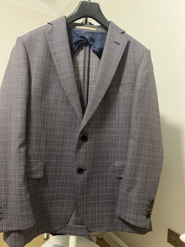 Gri ekose desenli erkek takım elbise ceketi, düğmeli ve normal kesimdir. Uzun kollu ve klasik modern stilde, ofis kullanımı için uygundur. ️