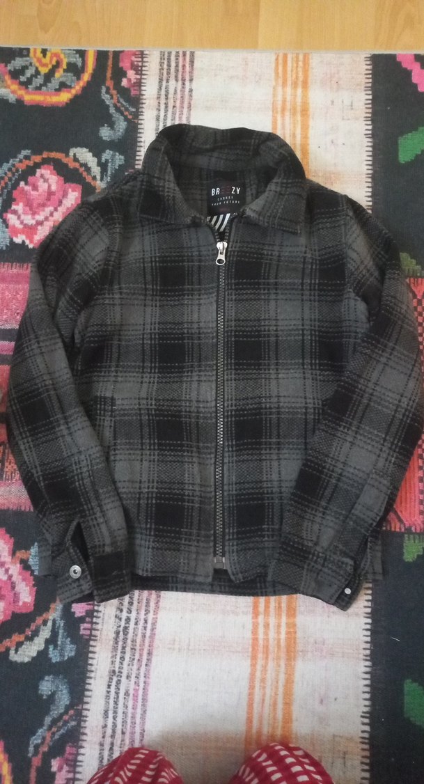 Fermuarlı, gri ekose desenli, yumuşak ve sıcak kumaştan erkek ceketi. Notlu yaka ve dar kesimle trend sokak stili için uygun.