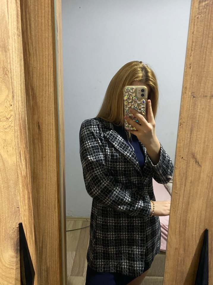 Gri ekose desenli kadın blazer, kesik yakalı, uzun kollu ve düğmeli ön kısmıyla dikkat çeker. Rahat sentetik kumaştan üretilmiş, normal kesim ve midi boydadır. Trendy günlük kullanıma uygundur.