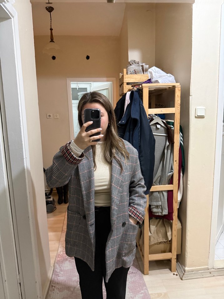 Gri ekose desenli kadın blazer ceketi, düğmeli ve yaka detaylıdır. normal kesim ve midi boydadır, günlük ve iş stiline uygundur.