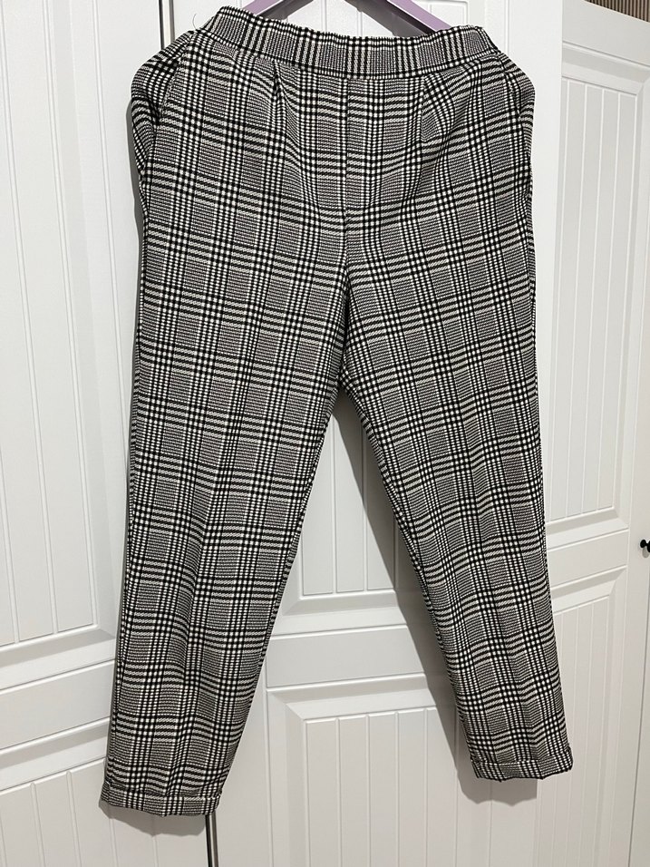 Gri ekose desenli kadın kumaş pantolon, normal boy ve pileli detaylara sahip. Sentetik kumaştan, günlük ve iş stiline uygun rahat kesim.