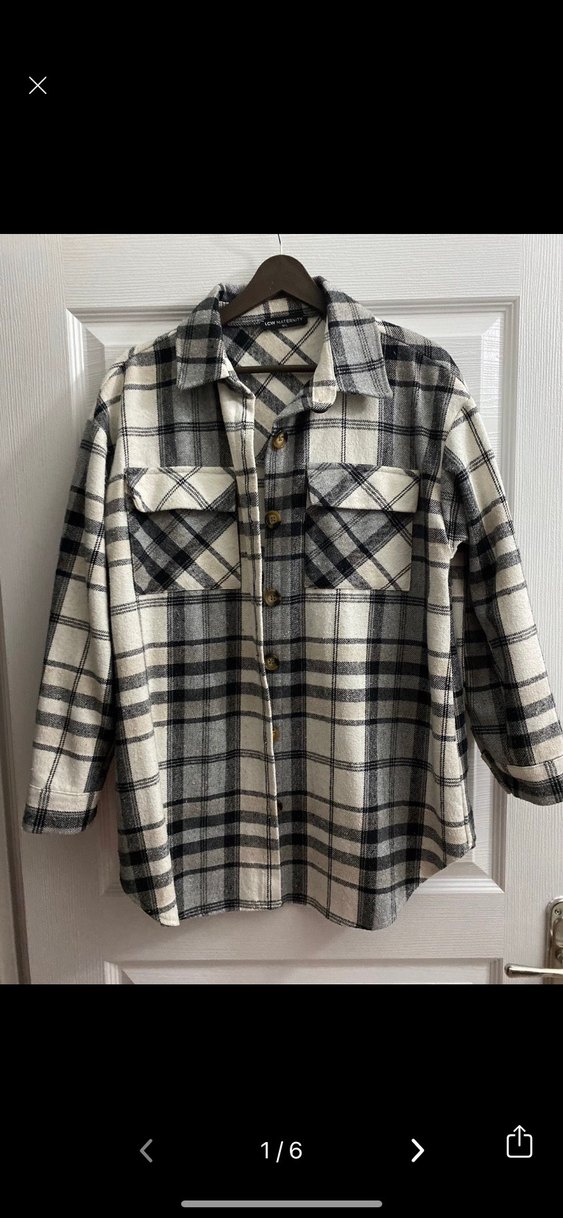 Kadınlar için düğmeli, uzun kollu ve yaka detayı bulunan pamuk gömlek. Gri renkli, ekose desenli ve bol kesimdir. İki kol arası 55cm boy 75cm