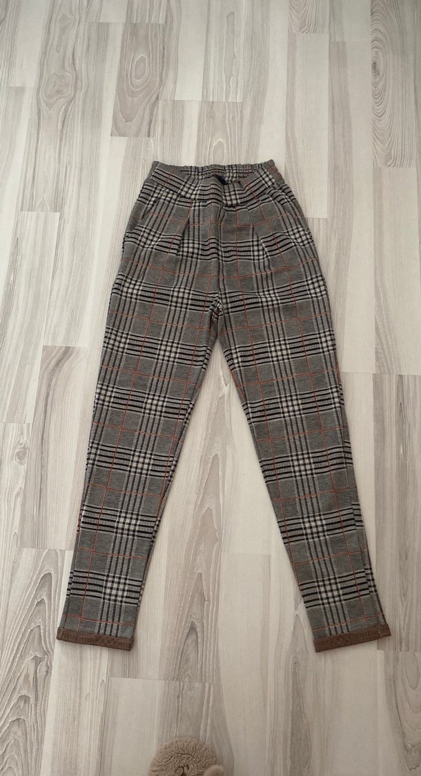 Gri ekose desenli, kemerli ve normal kesim kadın kumaş pantolon, günlük kullanıma uygun rahat bir tarza sahiptir.