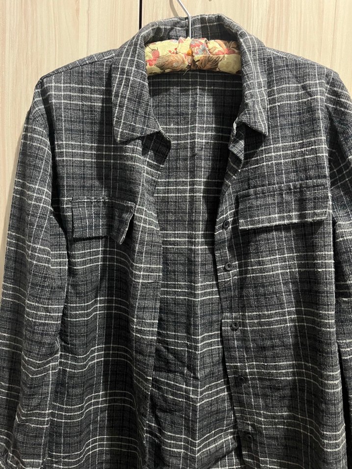 Gri ekose desenli keten gömlek. Salaş kesim ve uzun kollu, günlük sokak stiline uygundur.