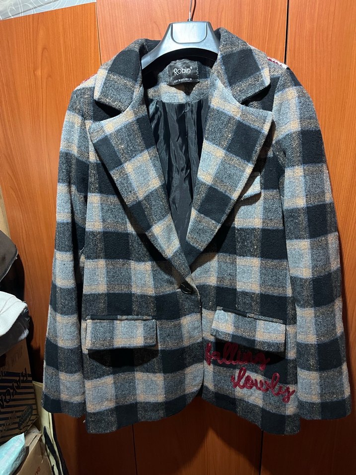 Gri ekose desenli, düğmeli ve yün kumaştan kısa kesim kadın blazer ceket. Uzun kollu ve günlük kullanıma uygun rahat kesim.