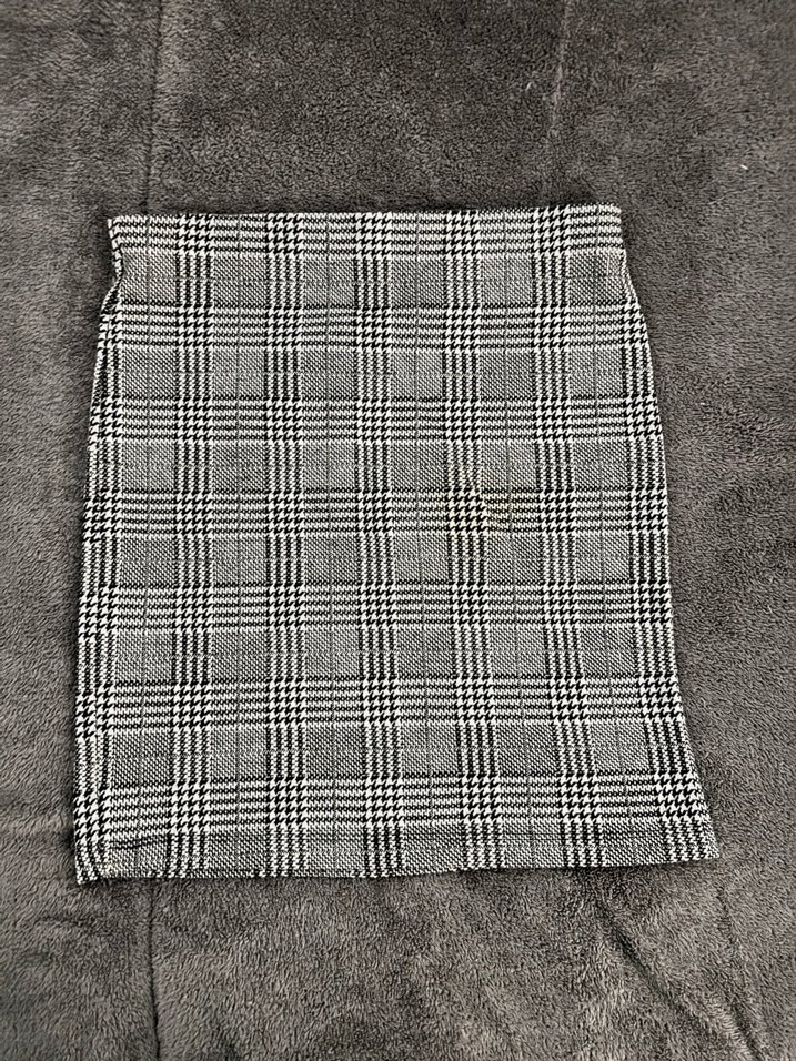 Kadın midi etek, gri ekose desenli ve kürk detaylı, yumuşak sentetik kumaştan. Normal kalıp ve rahat, sokak stili günlük kullanım için uygundur.