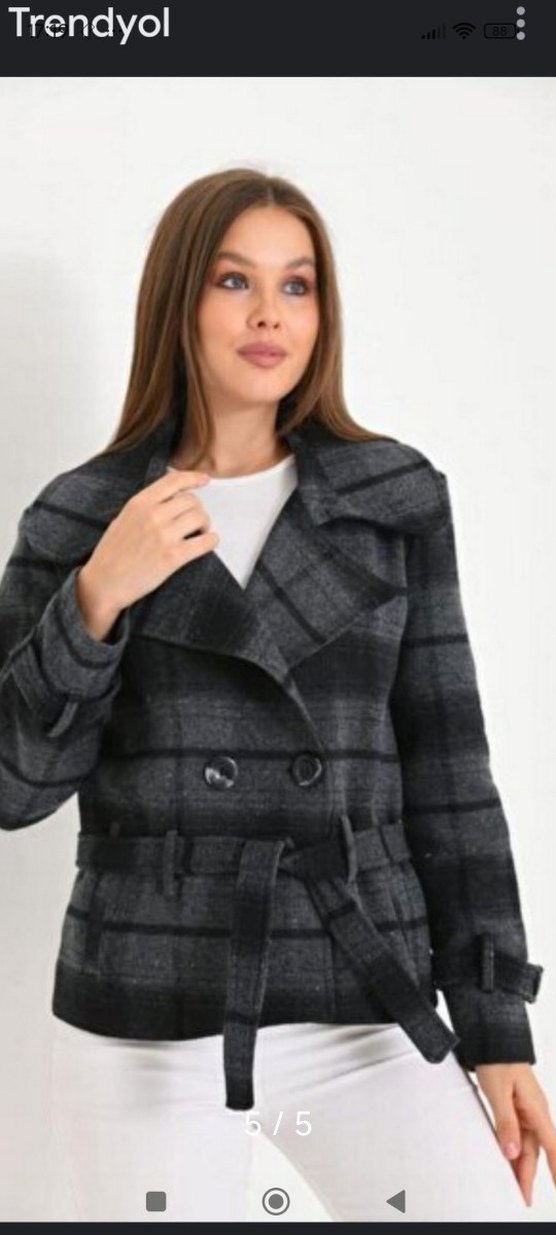 Gri ekose desenli midi kaban, kesik yaka ve düğmeli ön kısmıyla dikkat çeker. Uzun kollu ve rahat kesimdir, yumuşak ve sıcak kumaştan yapılmıştır.