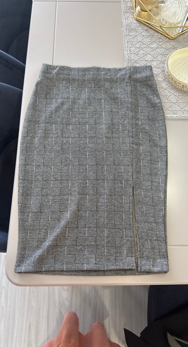 Gri ekose desenli, sentetik kumaştan yapılmış, fermuarlı ve kalem kesim midi etek. Ofis ve günlük şıklık için uygundur. ✨