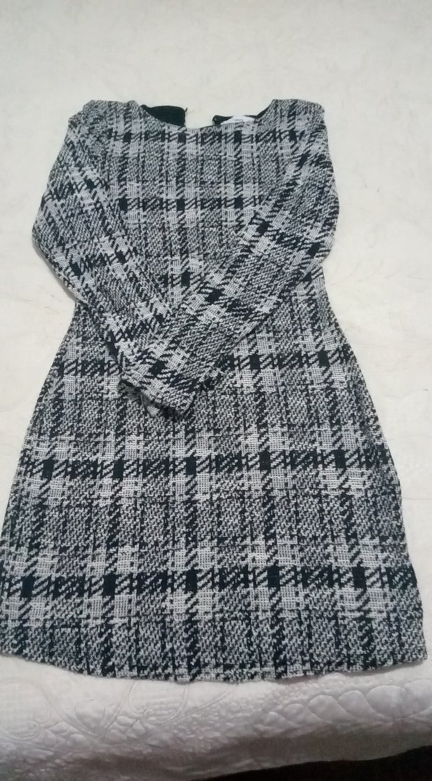 Gri ekose desenli, örgü dokulu, tekne yaka, uzun kollu ve vücuda oturan midi boy elbisedir. Rahat ve sokak stiline uygundur.