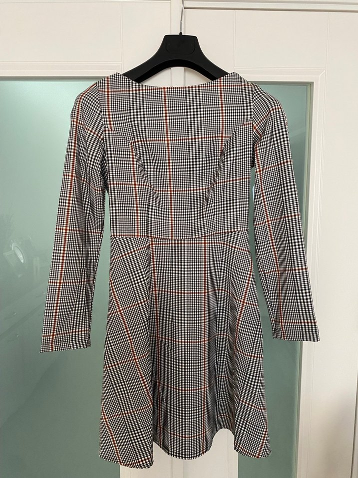 Gri ekose desenli midi elbise, uzun kollu ve tekne yaka ile kemer detaylıdır. Ofis için uygun, rahat kesim ve şık sokak stili sunar.