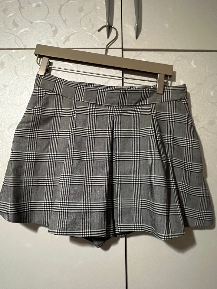 Gri ekose desenli mini etek, bol kesim ve sentetik kumaştan üretilmiştir. Günlük kullanıma uygun, trend sokak stili için ideal.