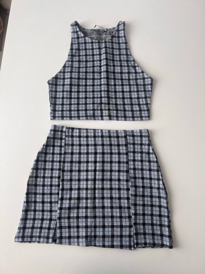 Gri ekose desenli, pilili ve dar kesim mini etek ve crop üstü.Suni kumaştan üretilmiş, günlük ve sokak stiline uygun.
