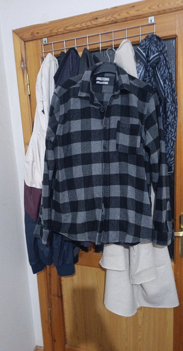 Pamuklu kumaştan yapılmış, gri ekose desenli, uzun kollu, düğmeli, normal boyda ve bol kesim erkek gömleği. Rahat ve günlük kullanım için uygundur.
