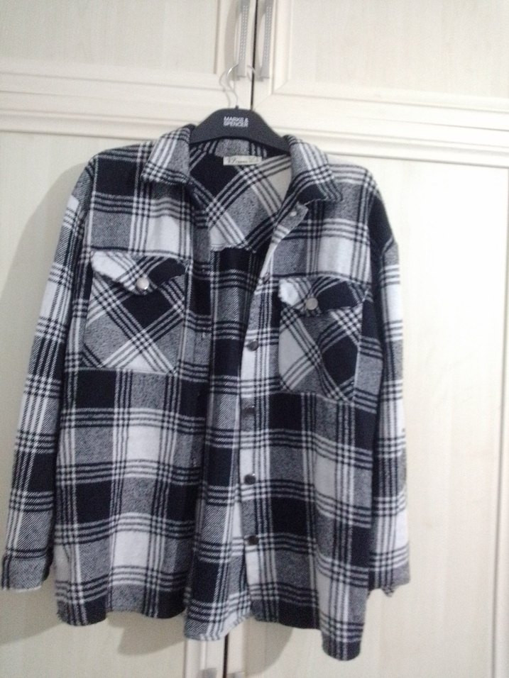 Gri ekose desenli, pamuklu kumaştan, uzun kollu, düğmeli ve notlu yakalı, bol kesim kadın gömleği. Günlük rahat kullanıma uygun.