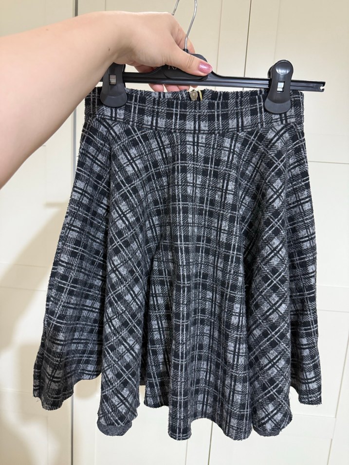 Gri ekose desenli mini etek, bol kesim ve pileli beli yüksek bel şık bir etek uzun zamandır giymedim diye fermuarı sararmış ama değiştirebilirsiniz rahatsız olursanız siz kendiniz. Markası yok defosuz
