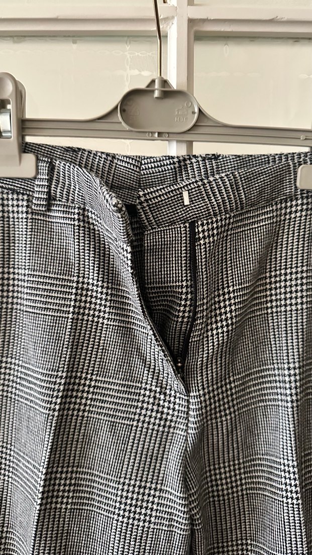 Gri ekose desenli, pilili, midi boy, regular fit kadın kumaş pantolon. Ofis kullanımına uygun, yün kumaştan üretilmiştir.